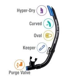 De snorkel met total dry top voorkomt dat er water in de snorkel komt. Je kunt er zelfs mee onder water! Komt er toch water in je snorkel dan blaas je dit eenvoudig uit via het waterloosventiel. Daarnaast heeft de snorkel een flexibele buiszone. Zo is het mondstuk perfect te positioneren.