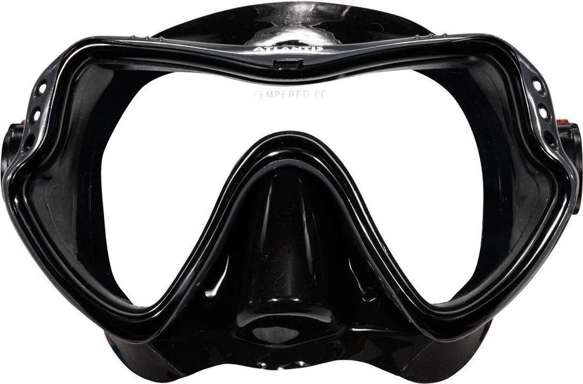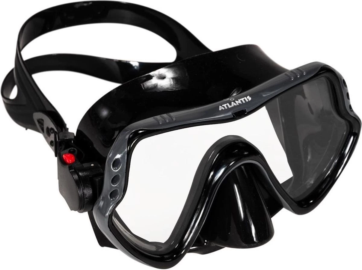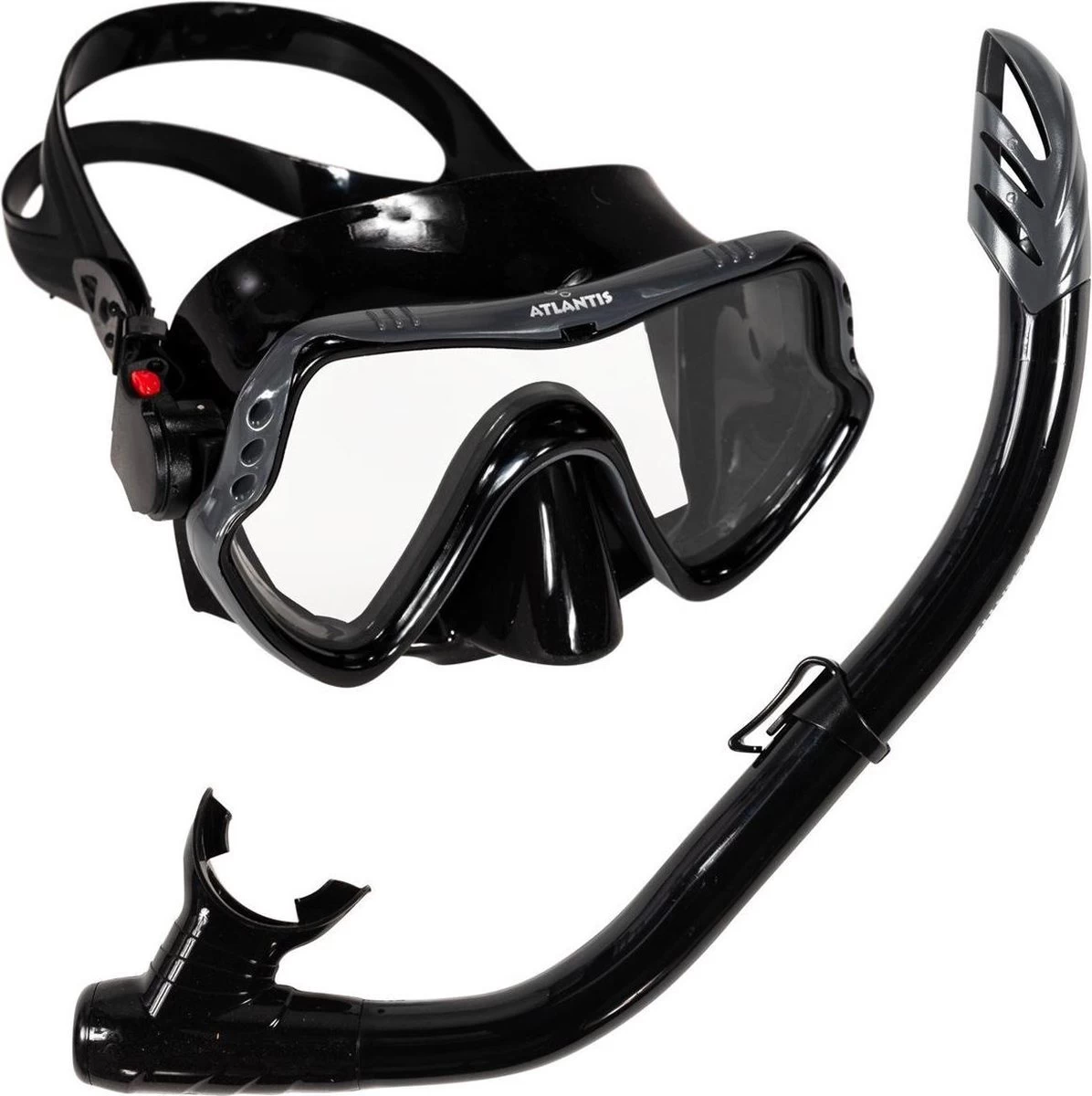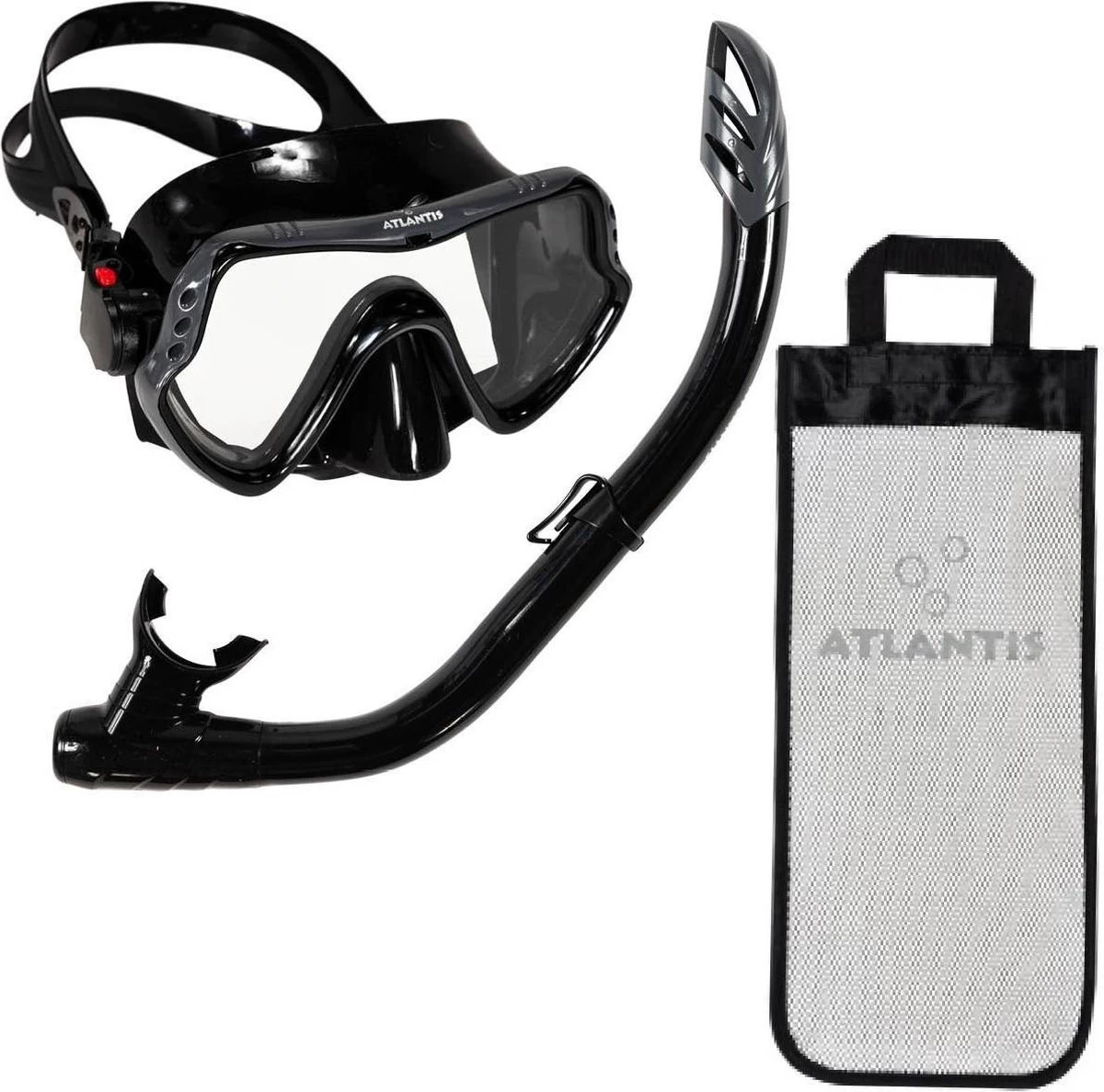 Snorkelset Samana Pro van Atlantis is dé perfecte set voor de vakantieganger! De duikbril is gemaakt van comfortabel hypoallergeen zwart siliconen dat vervelende lichtinval voorkomt. De maskerband is eenvoudig te verstellen middels de gespen aan de zijkant. De dry top op de snorkel voorkomt het binnendringen van water. Komt er toch water in je snorkel? Dan blaas je dit eenvoudig weer uit via het waterloosventiel.